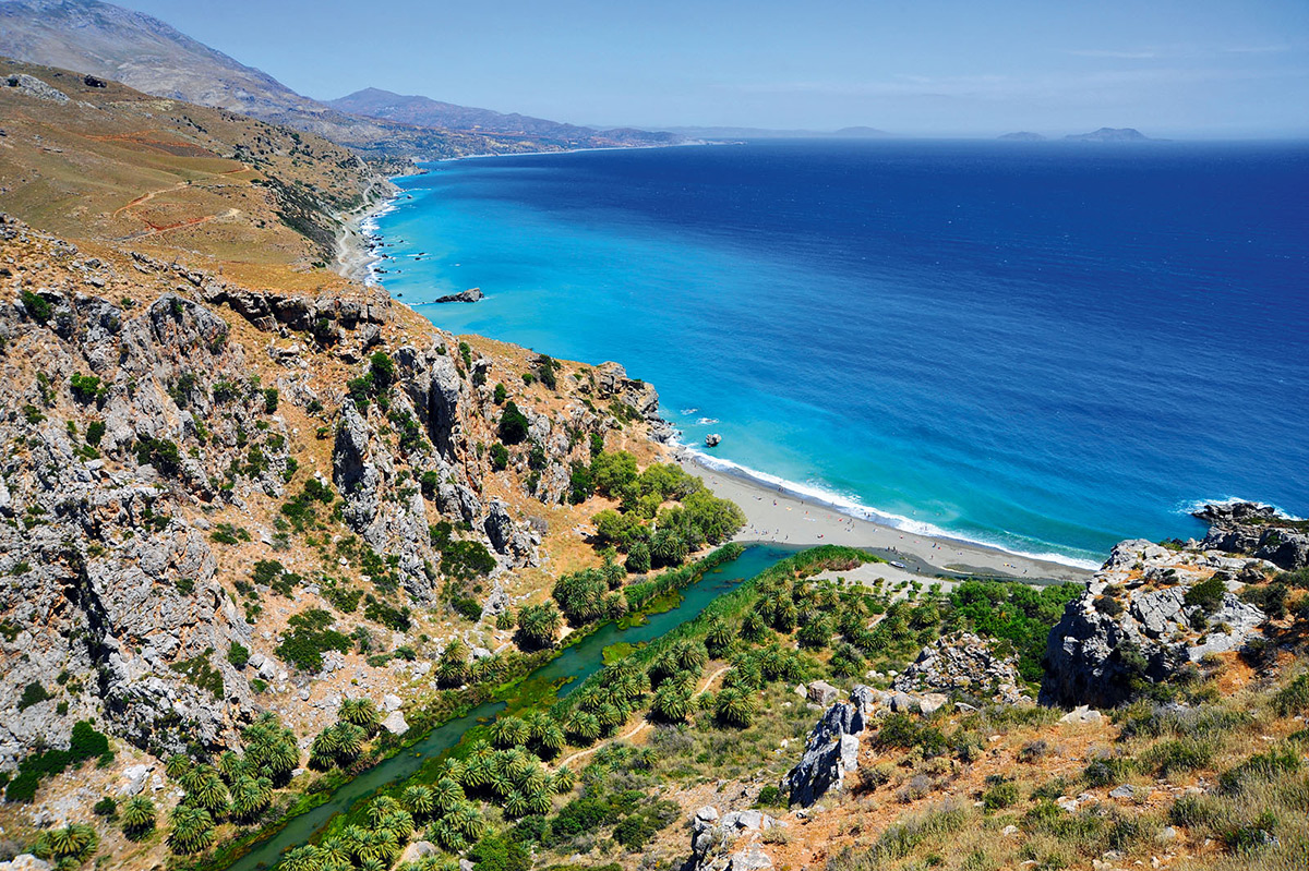 La playa de Preveli se sitúa a la salida del desfiladero de Kourtaliotiko donde el río Megas se encuentra con el mar. A lo largo del río hay un gran bosque compuesto de la rara palmera datilera de isla de Creta. Esto le da a la zona un aspecto único, casi tropical y sin duda ha contribuido a que esta playa sea muy famosa y popular a pesar de su lejanía. Puede caminar en el bosque de palmeras, pero acampar está estrictamente prohibido, y podrá bañarse en el río si lo desea. Muchos de los visitantes de la playa de Preveli también vendrán a la zona para visitar el famoso monasterio de Preveli.